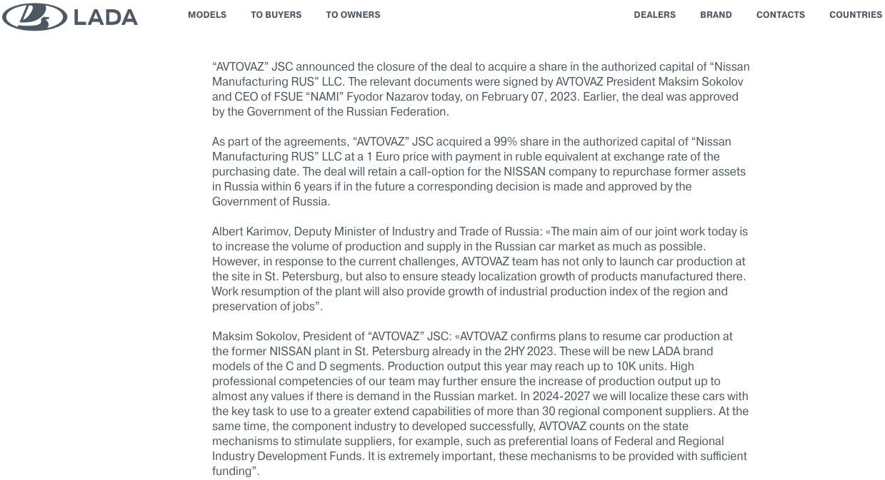 2月7日,俄罗斯伏尔加汽车厂(AvtoVAZ)发布消息宣布已完成对日产汽车位于俄罗斯圣彼得堡工厂的收购,当天双方签署了相关收购协议。作为协议的一部分,俄罗斯伏尔加汽车厂以1欧元的象征性价格收购了日产汽车在圣彼得堡工厂的99%股份,剩余的1%由俄联邦中央汽车和发动机研究所(NAMI)保留,交易保留了日产买入期权,如未来日产做出相关决定并得到俄联邦政府批准,日产有权在6年内回购其在俄资产。2022年1...