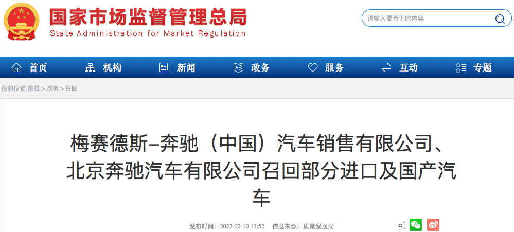 2月10日,国家市场监督管理总局发布公告,两大豪华品牌梅赛德斯-奔驰和奥迪在国内启动召回。公告显示,梅赛德斯-奔驰(中国)汽车销售有限公司、北京奔驰汽车有限公司根据《缺陷汽车产品召回管理条例》和《缺陷汽车产品召回管理条例实施办法》的要求,向国家市场监督管理总局备案了召回计划,计划召回以下车辆,召回数量共计293辆。一、自2023年2月13日起,梅赛德斯-奔驰(中国)汽车销售有限公司召回生产日期在2...