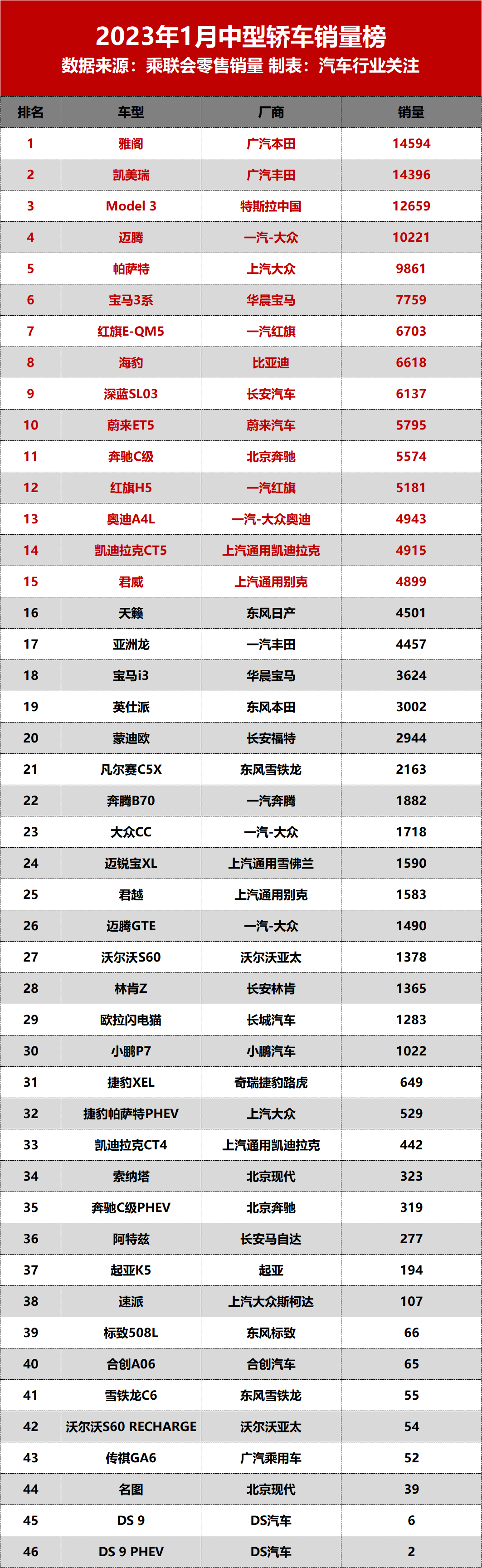 在刚刚过去的2023年1月份中,受春节传统节假日以及消费需求提前透支影响,部分车型的销量都出现明显下滑。从《汽车行业关注》统计的2023年1月中型轿车销量榜单来看,2023年1月共有四款车型销售超万辆,分别为雅阁、凯美瑞、Model3和迈腾。从车型品牌上来看,挤进榜单前十中共有2款日系车型,1款美系品牌,3款德系品牌,4款中国品牌,这也意味着国产车型开始冲击合资车的地位了。细分看,1月本田雅阁以1...