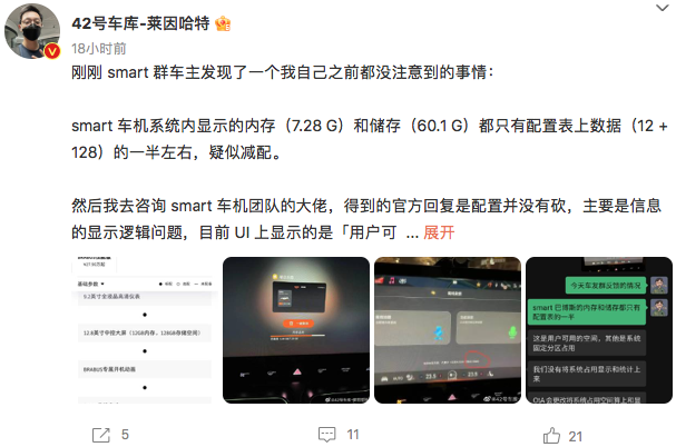 据汽车博主称,近日有smart精灵#1车主称,smart车机系统内显示的内存(7.28G)和储存(60.1G)都只有配置表上数据(12+128)的一半左右,疑似减配。针对“smart精灵#1车机内存及存储空间减配”传闻,2月12日,smart品牌发布官方发布声明回应。smart在声明中表示,首先,smart精灵#1车机配备了高通骁龙8155芯片,在高通Hypervisor系统上运行仪表和信息娱乐两...