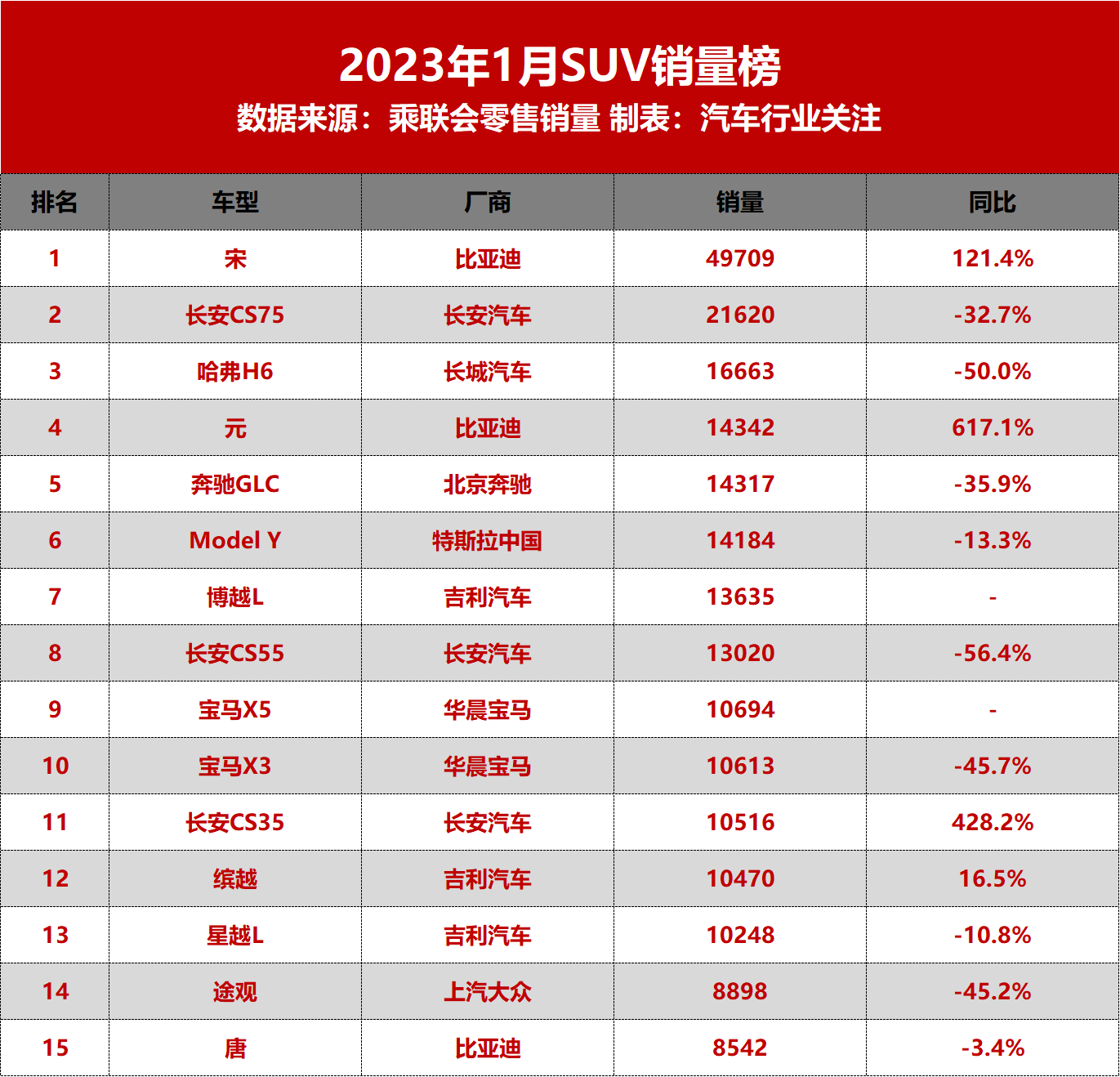 数据显示,2023年1月国内狭义乘用车市场销量为129.3万辆,同比下滑37.9%,环比下滑40.4%。其中1月SUV销量为62.3万辆,同比增长36.2%,环比下降39%,细分到具体SUV车型中能明显感受到车市洗牌动作,表现最突出为日系车型,1月日系多款主力SUV销量全部跌出SUVtop15销量榜单。从2023年1月SUVtop15销量榜单来看,共有13款车型销量超万辆,其中比亚迪宋以4.97万...