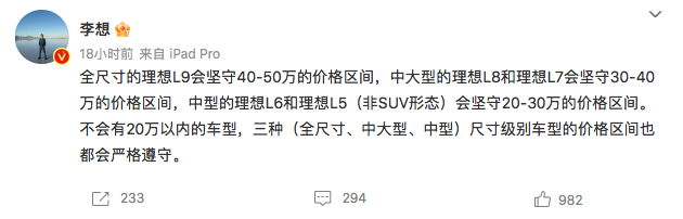1月30日晚间,理想汽车CEO李想在个人微博发布一则关于理想L系列车型售价区间信息,其中提及理想L5全新车型,并称该车为非SUV形态中型车,售价区间为20万-30万元。另外,李想还分别梳理了理想L系列车型对应的价格区间,李想表示:“全尺寸的理想L9会坚守40-50万的价格区间,中大型的理想L8和理想L7会坚守30-40万的价格区间,中型的理想L6和理想L5(非SUV形态)会坚守20-30万的价格区...