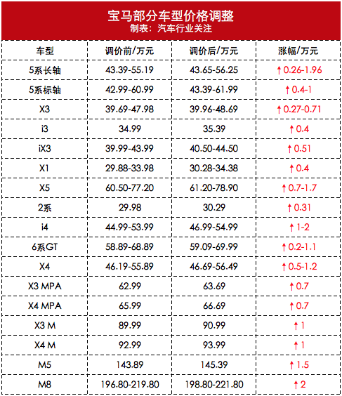 《汽车行业关注》从宝马官网了解,2月1日起,宝马品牌多款车型售价上调,调价车型涵盖宝马2系、宝马i3、宝马i4、宝马5系、宝马6系GT、宝马8系、宝马X1、宝马X3、宝马iX3、宝马X4、宝马X5及多款M车型,几乎涉及在售的所有主销车型,其中最高涨幅为2万元。从本次宝马品牌调价车型来看,宝马5系车型涨幅在2600元-19600元之间,其中宝马5系长轴距版共提供10款车型,调整后售价区间为43.65...