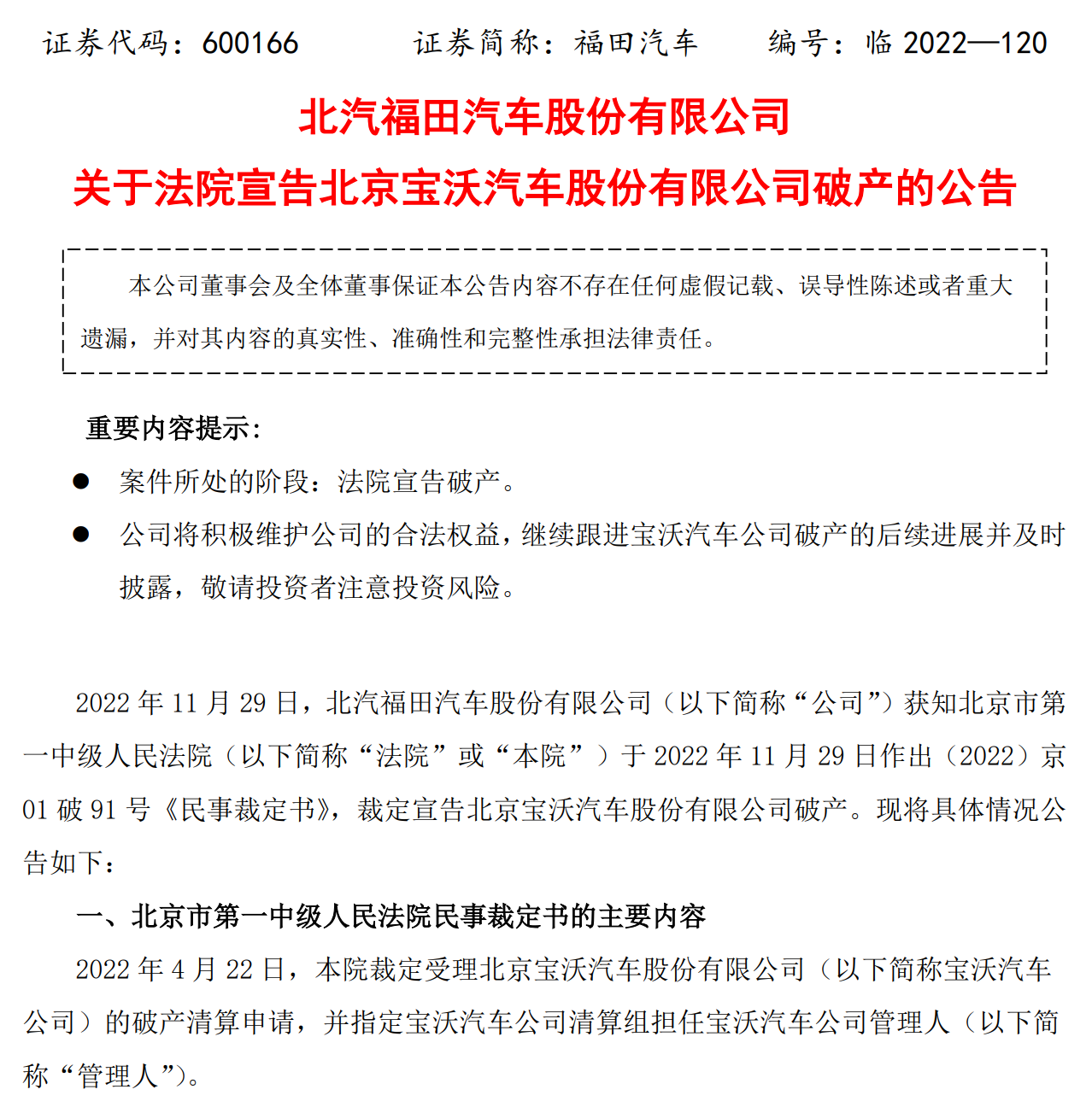 入华8年,几经转手,自称与奥迪、宝马、奔驰齐名的宝沃汽车终以”破产“告终。11月29日晚间,北汽福田汽车股份有限公司(下称“福田汽车”)发布公告称,北京市第一中级人民法院(以下简称“法院”或“本院”)于11月29日作出(2022)京01破91号《民事裁定书》,裁定宣告北京宝沃汽车股份有限公司破产。法院认为,根据债权确认结果及经评估确认的债务人资产情况,宝沃汽车公司不能清偿到期债务且资产已经明显小于...