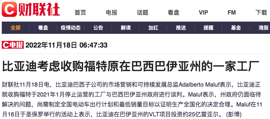 比亚迪又要在海外市场展开大动作了。11月18日,据彭博以及财联社等媒体报道,比亚迪正就收购福特于2021年1月停止运营的工厂与巴西巴伊亚州政府进行谈判。针对此消息,前几日,比亚迪董事长兼总裁王传福在一段祝贺比亚迪巴西新车上市的视频中透露部分比亚迪将在巴西建厂细节,王传福表示:“未来将开启在巴西的本地化生产,将继续拓展美洲战略布局,将为美洲市场引入更多全矩阵产品。”此前,比亚迪曾表示将从11月开始在...