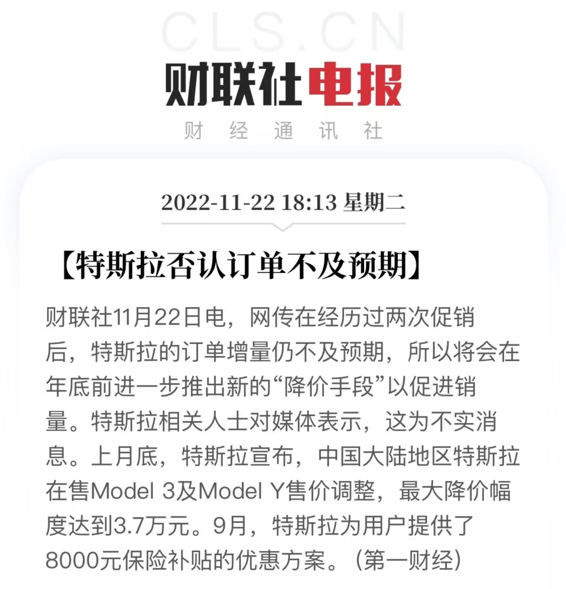 11月22日,一则《两波促销不好使,特斯拉还会降价》报道在网上广泛传播。报道指,在经历过两次促销后,特斯拉的订单增量仍不及预期,所以特斯拉将会在年底前推出新的“降价手段”,促进销量。针对此消息,特斯拉相关人士向媒体表示,这是不实消息。上月底,特斯拉宣布,中国大陆地区特斯拉在售Model3及ModelY售价调整,最大降价幅度达到3.7万元。9月特斯拉为用户提供了8000元保险补贴的优惠方案。据汽车行...