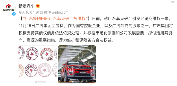 针对网上曝光的“广汽菲克破产引发26家经销商集体维权“事件,今日,11月15日,广汽集团做出回应。广汽集团表示,作为国有控股企业,以及广汽菲克的股东之一,广汽集团将积极支持其债权债务依法依规处理;并根据市场化原则和公司发展需要,探讨活用其资产、资源的重整措施,尽力维护和保障各方合法权益,届时会根据信披要求进行相关披露。同时,广汽集团将督促广汽菲克根据《汽车销售管理办法》《企业破产法》等法律法规,配...