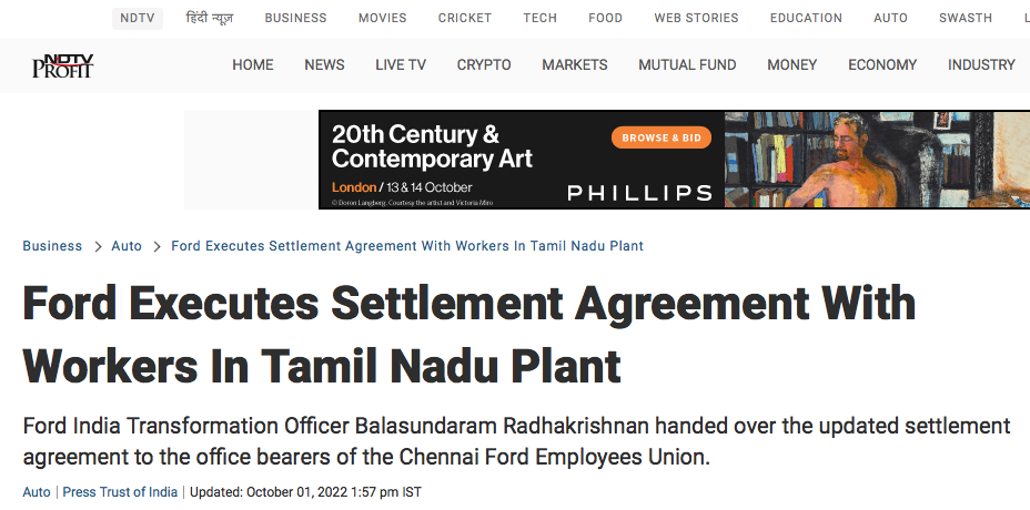 据印度新德里电视台(NDTV)等印媒报道,福特汽车印度分公司于去年宣布关闭其在印工厂后,与印度泰米尔纳德邦工厂的工人达成遣散补偿协议,每位员工平均获62个月薪水。报道称,福特印度公司转型官BalasundaramRadhakrishnan在一份声明中表示,福特汽车与代表2592名长期雇员的钦奈福特雇员工会达成一致,最终的和解方案是为每个雇员提供平均约62个月的薪水,以保证为他们“提供足够财务缓冲和...