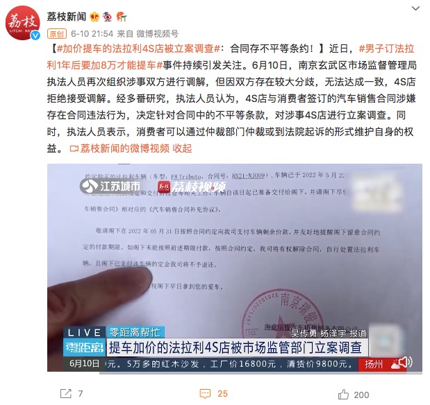 订法拉利提车时被临时要求加8万才能提车事件最新进展:涉事4S已被立案调查。据荔枝新闻报道,经多番研究,南京玄武区市场监督管理局执法人员认为,4S店与消费者签订的汽车销售合同涉嫌存在合同违法行为,决定针对合同中的不平等条款,对涉事4S店「南京瑞骏汽车销售服务有限公司」进行立案调查。执法人员指出,因为涉事4S店涉及的购车人数比较多,并且4S店的合同内容里面加重了消费者的权利问题,因此对涉事4S店进行了...
