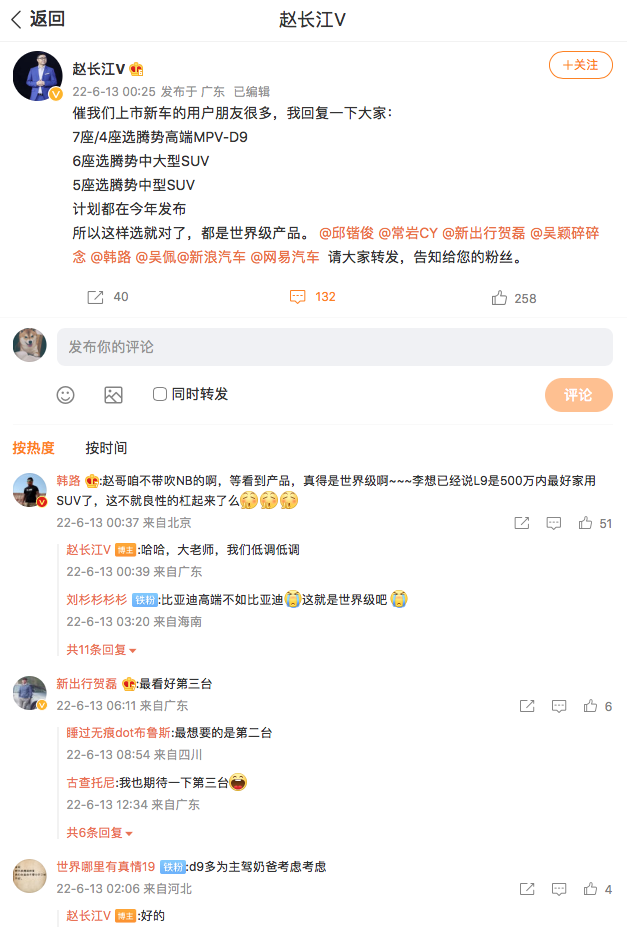 6月13日,比亚迪腾势销售事业部经理赵长江发表微博称,最近很多用户朋友催他们上市新车,其表示:预计今年将发布三款世界级产品,包括7座/4座选腾势高端MPV-D9、6座选腾势中大型SUV以及5座选腾势中型SUV。据汽车行业关注此前报道,腾势高端MPV-D9是比亚迪主导腾势品牌之后的首款产品,新车已于5月16日正式公布车辆预售价,新车定位中大型MPV,共推出DM-i超级混动版和纯电两种动力选择,其中D...