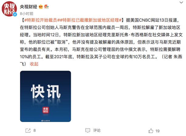 继特斯拉CEO埃隆·马斯克发布将在全球范围内裁员一周后,6月13日,综合多家媒体报道,特斯拉已解雇了驻新加坡地区经理ChristopherBousigues。与此同时,在一份特斯拉内部备忘录中,马斯克要求“员工要加倍努力”。马斯克称,由于供应链短缺,2022年第二季度对特斯拉来说是一个“非常艰难的季度”,因此呼吁员工要加倍努力工作,帮助公司重回正轨。当地时间12日,特斯拉新加坡地区经理Christ...