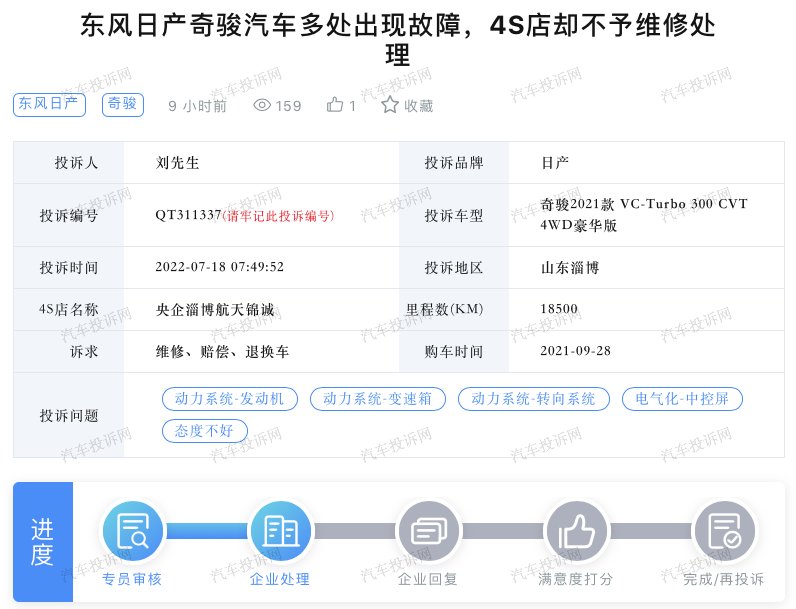 这两日,山东淄博一车主刘先生向媒体反映自己购买的一辆东风日产奇骏车,结果新车购买不到一年,前前后后就出现了11次故障问题,这令他十分无奈。据「山东电视生活频道栏目生活帮」媒体报道,刘先生这辆日产奇骏车于去年9月28日购买,新车购买第二天就出现故障问题——防撞系统报警,该问题还没有得到完全的解决,新车又出现了门子异响、倒车影像挂上挡以后黑屏的故障。刘先生描述称:“发动机变速箱漏油、电尾门打不开、防撞...