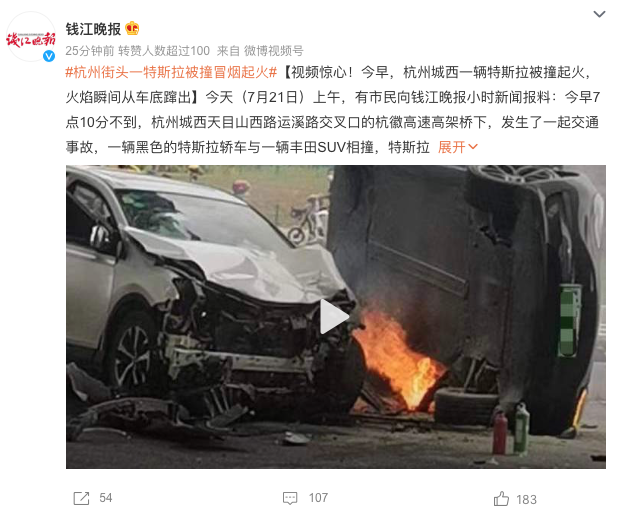 今日7点左右,浙江杭州城西发生一起特斯拉碰撞后起火事故。据多家媒体报道,事故发生在杭州城西天目山西路运溪路交叉口的杭徽高速高架桥下,一辆黑色特斯拉轿车在左转待行区起步,与车速较快的一辆白色丰田SUV直行车发生撞击,事故导致特斯拉被掀翻,与此同时在巨大的冲击力下,特斯拉底盘部位瞬间冒出明火,没一会特斯拉整车就开始剧烈燃烧起来,火势凶猛,而丰田SUV虽然没有起火,但碰撞痕迹也是惨不忍睹,几乎整个车头完...