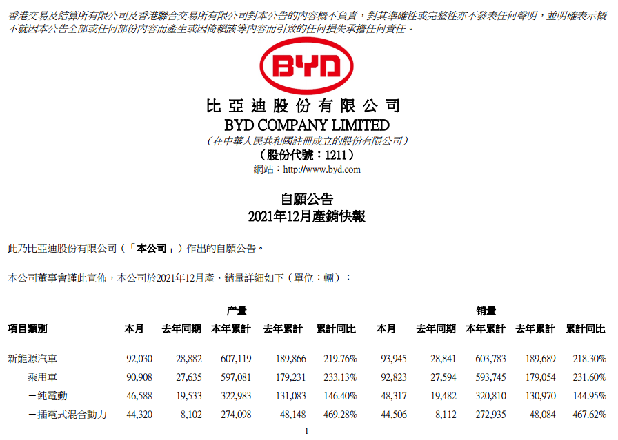 在多家造车新势力品牌公布2021年12月交付量后,今日,中国新能源汽车龙头比亚迪也对外公布了上个月的月产销快报。根据比亚迪发布的12月份产销快报数据显示,比亚迪12月汽车销量为99112 辆,同比增长75.97%,其中新能源汽车销量为93945辆,同比增长225.73%。从数据占比看,新能源汽车与燃油车两者之间的差距正在不断扩大。具体来看,12月份比亚迪新能源乘用车为92823辆,同比增...