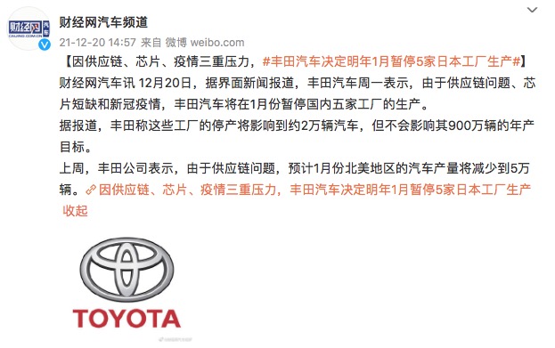 丰田汽车再宣布工厂停产。据媒体报道,丰田汽车周一表示将于明年1月份暂停5家日本工厂的生产,关于工厂停产的原因,丰田汽车称是因供应链危机、芯片短缺和新冠疫情等因素的影响。据了解,此次宣布的这一停产计划将影响大约2万辆汽车的正常生产。不过,丰田汽车强调不会影响900万辆的年产目标。12月15日,丰田汽车公布了2022年1月的生产计划。丰田汽车表示,2022年1月计划在全球生产80万辆汽车,2021财年...
