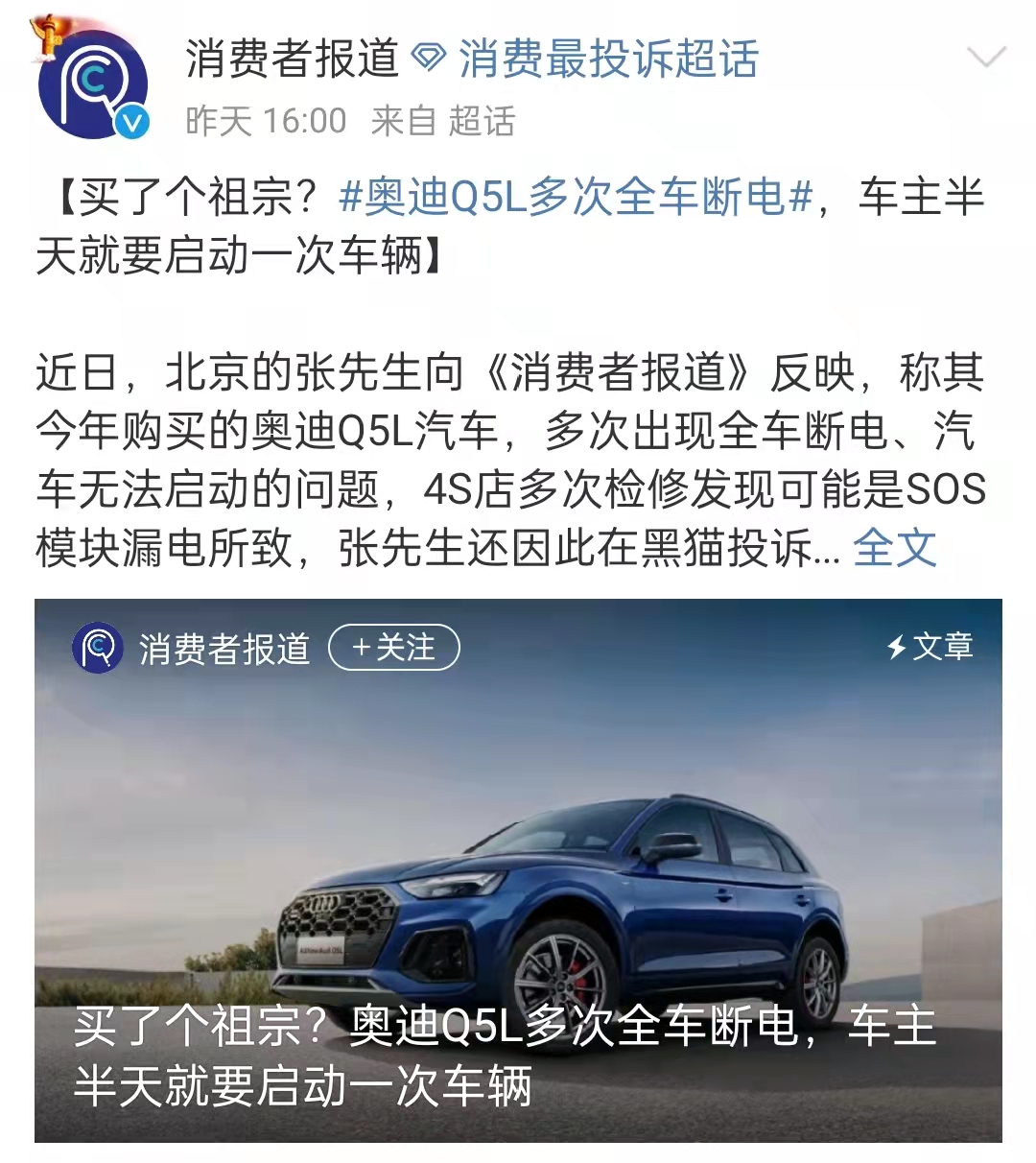 近日,车主张先生向媒体反映,自己购买的一辆奥迪Q5L车多次出现全车断电、汽车无法启动的问题,为此在黑猫投诉平台发帖进行了投诉。据《消费者报道》与黑猫投诉平台发帖介绍,张先生购买的奥迪Q5L是今年4月份在北京奥吉通奥迪经销商购买的,今年7月开始,张先生的这辆奥迪Q5L多次出现全车断电、无法启动的问题。张先生描述称:“整车断电,车辆根本打不着火,灯光那些都用不了。”于是张先生将车开至4S店维修,第一次...