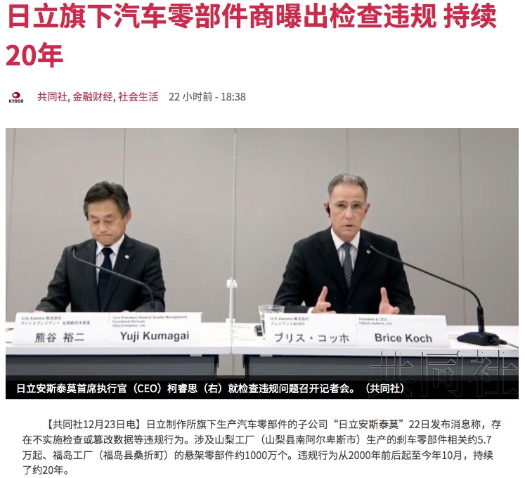 据媒体报道,12月22日,日立制作所旗下生产汽车零部件的子公司日立安斯泰莫被曝出检查违规问题。据介绍,该公司旗下工厂存在不检查或篡改数据等违规行为,违规产品涉及山梨工厂生产的5.7万起刹车零部件和福岛工厂约1000万个悬挂零部件。综合日媒报道称,日立安斯泰莫被曝出的违规问题中,与刹车性能有关的违规行为是在制动测试中伪造数据,而悬挂部件的违规行为则是交付了不符合要求标准的产品。根据调查,被曝的这项违...