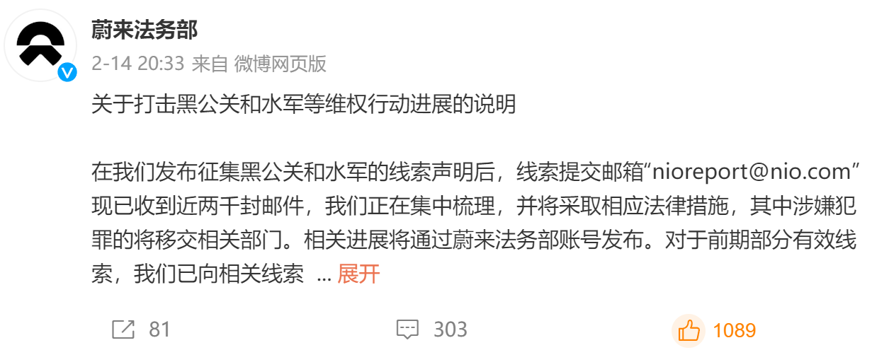 2月17日,蔚来法务部发布《关于针对某网络账号造谣的法律行动的说明》。蔚来法务部表示:“于2月16日晚收到线索,反映网络账号‘尹哥普及新能源’以‘爆个大料’这种耸人听闻的方式,造谣散布关于乐道品牌的严重失实内容。”对于网络账号“尹哥普及新能源”的造谣内容,蔚来法务部已固定证据,并已向法院提起诉讼,调取该涉嫌侵权网络账号的身份主体信息,与此同时也已向公安机关报案,请求公安机关予以调查。据了解,上述提...