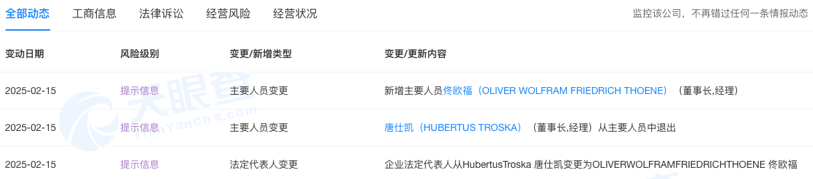 天眼查信息显示,2月15日,梅赛德斯-奔驰(中国)投资有限公司发生工商变更,唐仕凯(HUBERTUSTROSKA)卸任法定代表人、董事长、经理,由佟欧福(OLIVERWOLFRAMFRIEDRICHTHOENE)接任。梅赛德斯一奔驰(中国)投资有限公司成立于2001年1月,注册资本为5.03亿美元,目前法定代表人为佟欧福。股权信息显示,该公司由梅赛德斯-奔驰股份公司全资持股。早在2024年12月1...