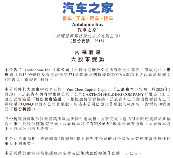 2月20日,汽车之家在港股发布公告称,海尔集团公司(下称“海尔集团”)旗下二手车业务公司CartechHoldingCompany(下称“卡泰驰控股”)与中国平安旗下YunChenCapitalCayman(下称“云辰资本”)达成协议,卡泰驰控股将以总价约18亿美金收购云辰资本持有的汽车之家已发行普通股股份。不过,本交易受成交条件约束,仍需获得监管部门的批准并满足相关交割条件。按计划,交易完成后,...