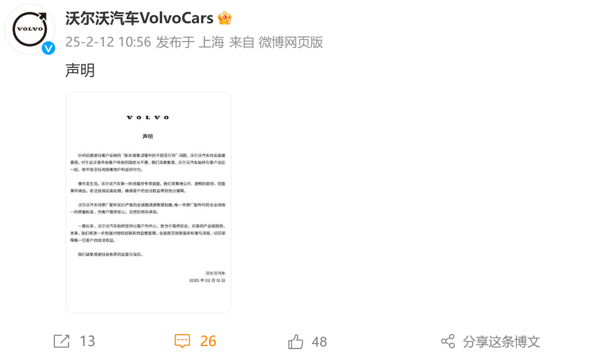 2月12日,沃尔沃汽车官方对近期用户反映的“新车销售过程中的不规范行为”问题做出回应。在声明中,沃尔沃汽车表示,对此事件高度重视,对于此次事件给客户带来的困扰与不便,深表歉意。沃尔沃汽车表示,绝不容忍任何损害用户利益的行为。事件发生后,沃尔沃汽车第一时间展开专项调查,沃尔沃汽车将秉持公开、透明的原则,彻查事件缘由,依法依规妥善处理,确保客户的合法权益得到充分保障。据了解,事情的起因是有车主发现自己...