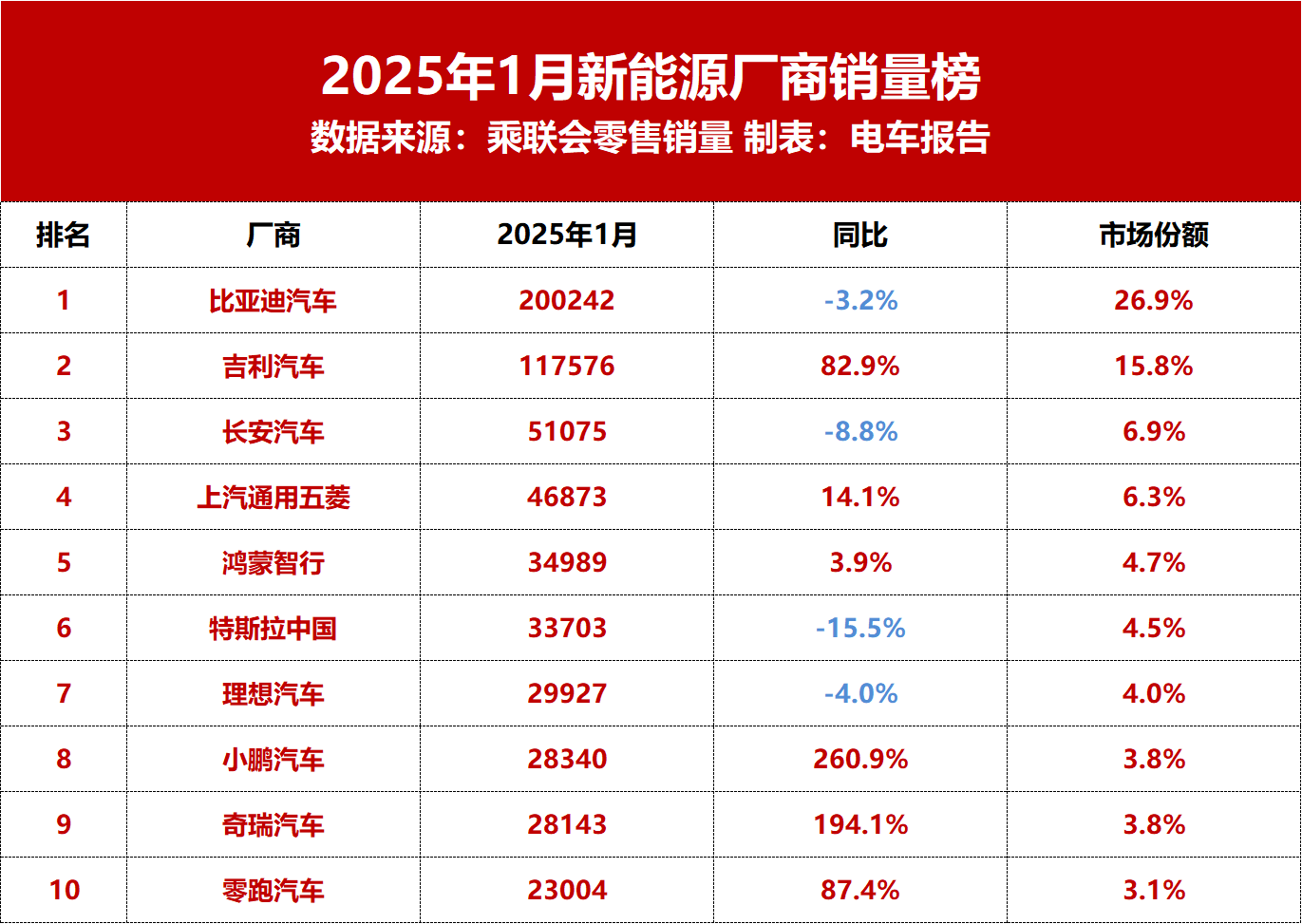 乘联会数据显示,2025年1月国内乘用车市场零售销量为179.4万辆,同比下滑12.1%,环比下滑31.9%。其中,新能源乘用车零售销量为74.4万辆,同比增长10.5%,环比下滑42.9%。从1月新能源厂商零售销量榜单来看,入榜销量榜前十名的车企分别为比亚迪汽车、吉利汽车、长安汽车、上汽通用五菱、鸿蒙智行、特斯拉中国、理想汽车、小鹏汽车、奇瑞汽车、零跑汽车。其中,涨幅最高的是小鹏汽车,同比增长2...