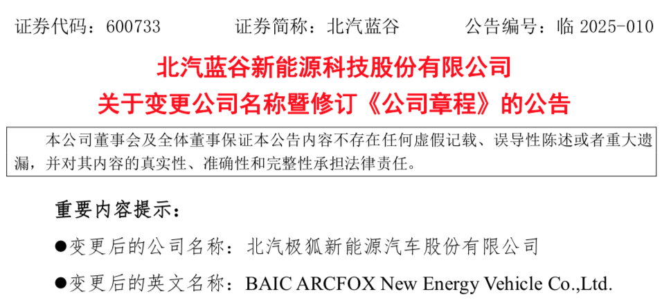 2月14日,北汽蓝谷发布公告称,公司拟将中文名称由“北汽蓝谷新能源科技股份有限公司”变更为“北汽极狐新能源汽车股份有限公司”,英文名称由“BAICBlueParkNewEnergyTechnologyCo.,Ltd.”变更为“BAICARCFOXNewEnergyVehicleCo.,Ltd.”。针对变更公司名称的原因,北汽蓝谷在公告中表示,公司现阶段处于战略升级关键期,改名原因是为了进一步聚焦新...