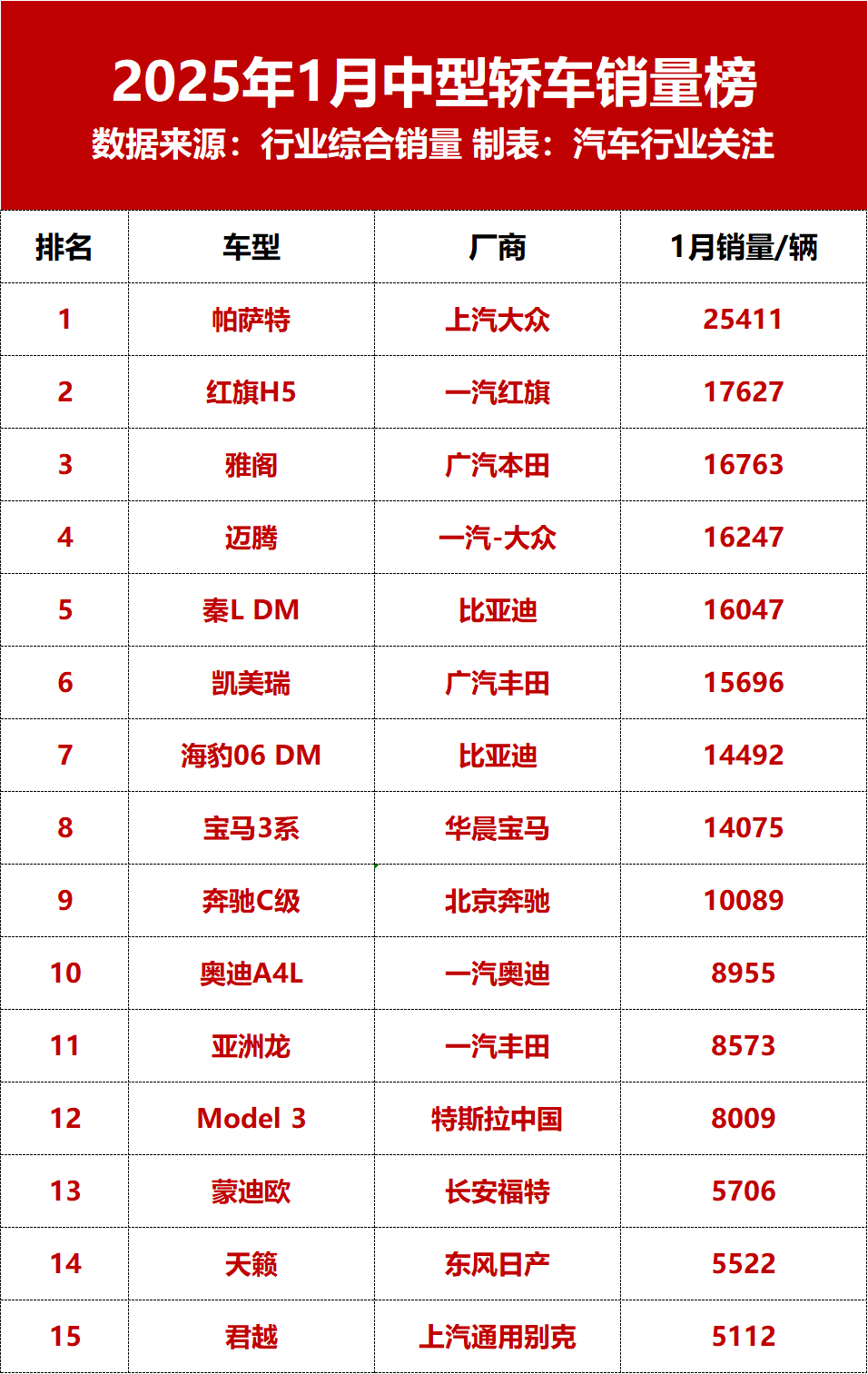乘联会数据显示,2025年1月国内乘用车市场零售销量为179.4万辆,同比下滑12.1%,环比下滑31.9%。其中,轿车为82.6万辆,同比下滑9.5%,同比下滑28.3%。从《汽车行业关注》统计的1月中型轿车销量top15榜单来看,1月共有9款车型销量超万辆,分别为帕萨特、红旗H5、雅阁、迈腾、秦LDM、凯美瑞、海豹06DM、宝马3系、奔驰C级,其中,红旗H5飙升第二名,表现非常强劲。具体来看,...