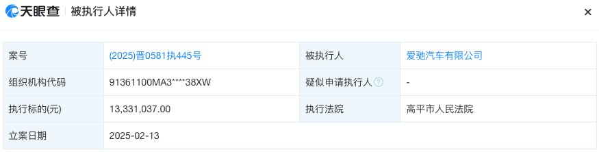 天眼查信息显示,2月13日,爱驰汽车有限公司(下称“爱驰汽车”)以及其子公司氢驰动力科技(山西)有限公司新增一则被执行人信息,执行标的1333万余元,执行法院为高平市人民法院。爱驰汽车有限公司于2017年2月成立,法定代表人为郭超,注册资本约8.68亿人民币,是一家以从事科技推广和应用服务业为主的企业。股东信息显示,该公司由宁波梅山保税港区凯玖投资管理有限公司、湖州奥驰投资合伙企业(有限合伙)、宁...