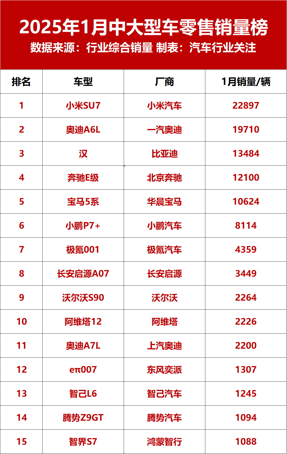 乘联会数据显示,2025年1月国内乘用车市场零售销量为179.4万辆,同比下滑12.1%,环比下滑31.9%。其中,轿车为82.6万辆,同比下滑9.5%,同比下滑28.3%。在轿车细分市场中,相比于中型轿车,中大型轿车占据的市场份额并不是特别大,但以小米SU7、比亚迪汉、极氪001等为代表的中大型轿车也有不错的表现。从《汽车行业关注》统计的1月中大型车销量top15榜单来看,1月共有五款车型销量超...