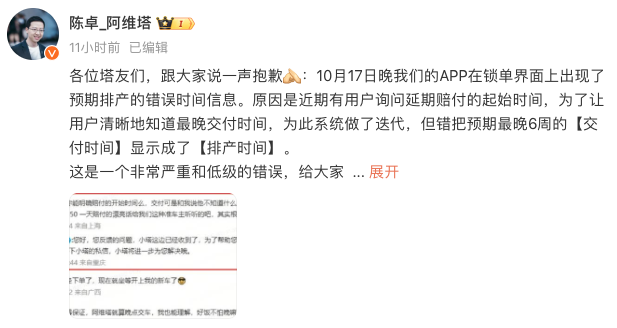 10月18日凌晨,阿维塔总裁陈卓在微博发文向用户致歉。陈卓表示,10月17日晚APP在锁单界面上出现了预期排产的错误时间信息。陈卓指出:“这是一个非常严重和低级的错误,给大家造成了误解和困扰,深表歉意”。之所以会出现这个错误是近期有用户询问延期赔付的起始时间,为了让用户清晰地知道最晚交付时间,阿维塔系统做了迭代,但错把预期最晚6周的“交付时间”显示成了“排产时间”。目前阿维塔的生产正在全力提速,并...
