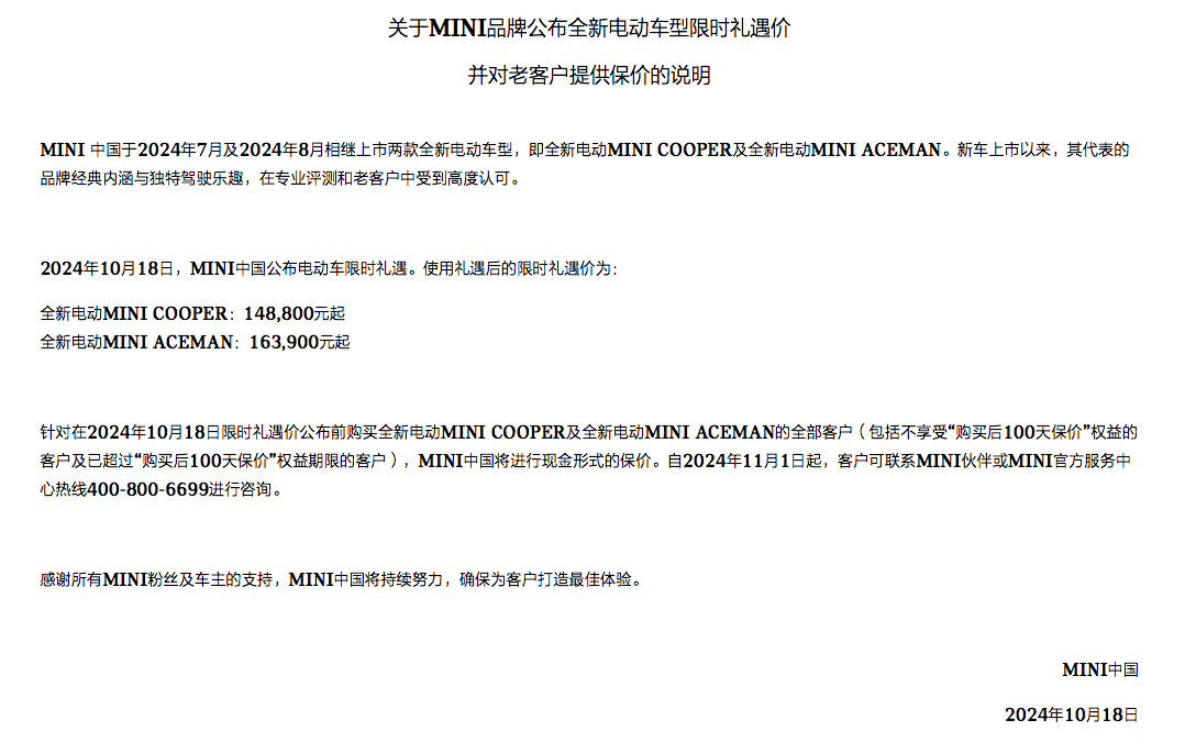 MINI中国官方宣布,自10月18日起,全新电动MINICOOPER售14.88万元起,相比于原先的18.98万元起的起售价降低4.1万元;全新电动MINIACEMAN售16.39万元起,相比于原先的20.99万元起的起售价降低4.6万元。与此同时,针对已购买上述两款纯电车型的老车主,MINI中国将实行现金形式的保价。细分到各大版本车型来看,官网显示,MINICOOPER取消了大玩家入门款车型,调...