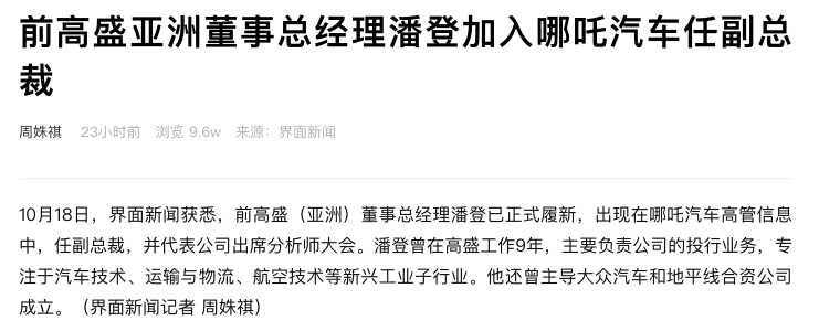 10月18日,据界面新闻报道,前高盛(亚洲)董事总经理潘登已履新,加入哪吒汽车担任副总裁,并代表公司出席分析师大会。市场上关于潘登的信息并不多。资料显示,潘登曾在高盛任职9年,负责投行业务,今年8月离职。在此之前,潘登曾在美林美银、美国咨询公司QRM任职,也曾主导大众汽车和地平线合资公司成立。目前潘登任哪吒汽车首席财务官(CFO)、副总裁。9月6日,哪吒汽车首席财务官陈睿离职,潘登接替陈睿职位,全...