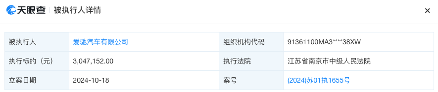 天眼查信息显示,10月18日,爱驰汽车有限公司新增一则被执行人信息,执行标的304.72万元,执行法院为江苏省南京市中级人民法院。这是本月以来,爱驰汽车有限公司第三次被列为被执行人。10月17日,爱驰汽车有限公司新增四则被执行人信息,执行标的分别为106.17万元、27.10万元、29.94万元、58.60万元,执行法院均为上饶市广信区人民法院;10月14日,爱驰汽车有限公司新增一则被执行人信息,...