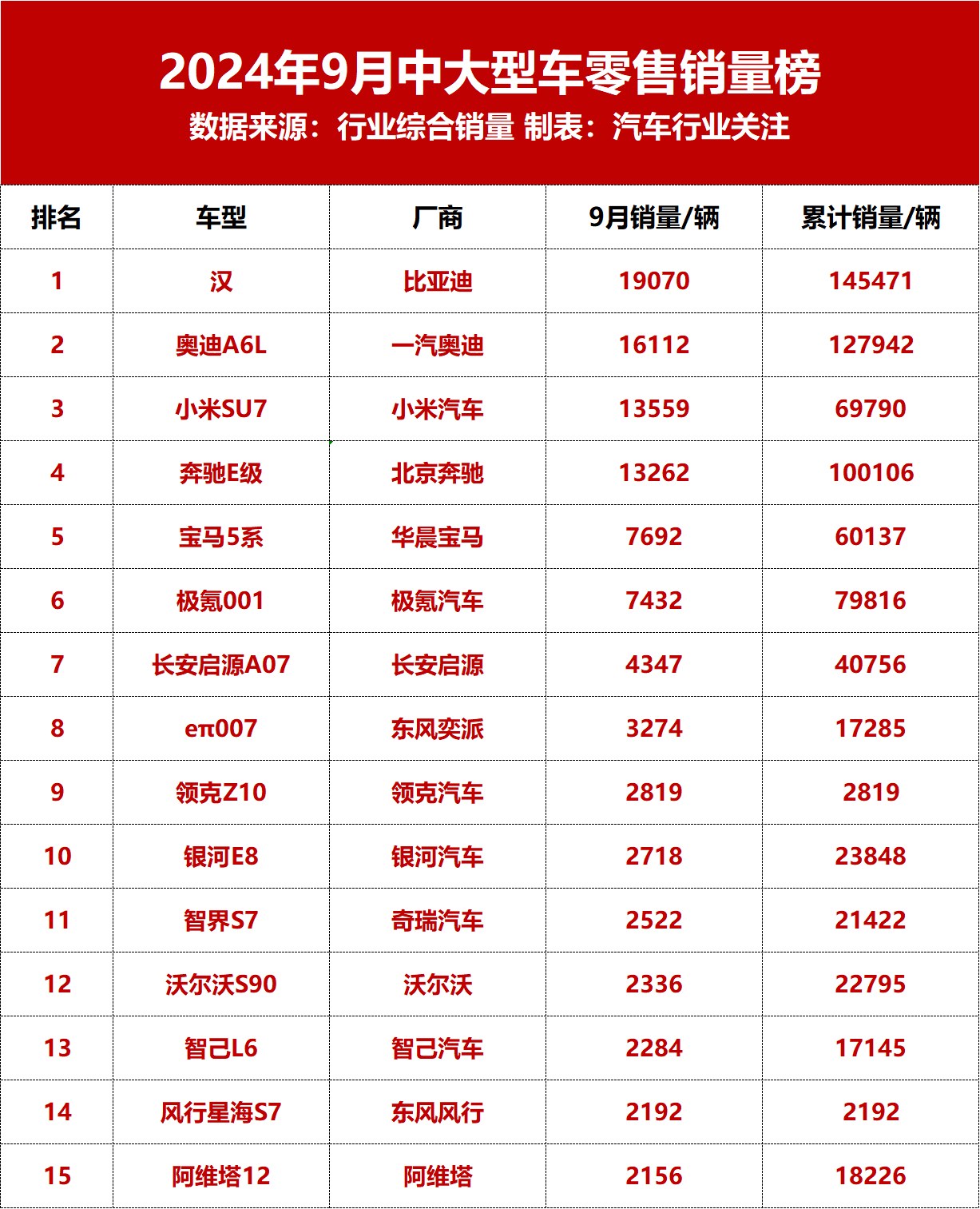 乘联会数据显示,9月国内乘用车市场零售销量为210.9万辆,同比增长4.5%,环比增长10.6%。其中,轿车销量为97.42万辆,同比增长3.9%,而中大型轿车销量为12.8万辆,占国内汽车总销量6.1%。从《汽车行业关注》统计的9月中大型轿车零售销量top15榜单来看,9月共有四款车型销量超万辆,分别为比亚迪汉、奥迪A6L、小米SU7、奔驰E级,销量分别为19070辆、16112辆、13559辆...