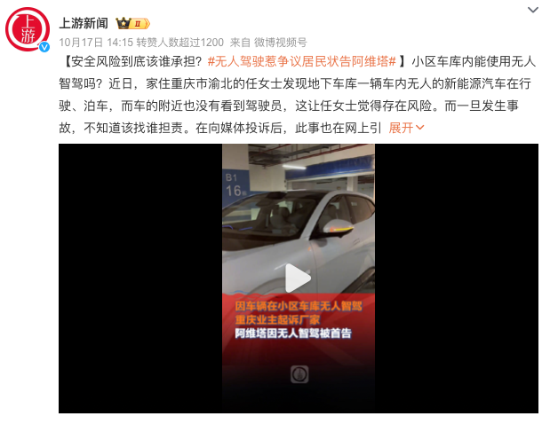 日前,重庆某小区一居民称自己在地下车库被一辆阿维塔07“吓到”,原因是该车在无人驾驶的情况下自动泊车,该居民担心不安全,于是向相关部门投诉。针对阿维塔07自动驾驶被小区居民投诉,10月18日,阿维塔官方在微博发布说明。阿维塔表示:“已第一时间与相关人士取得联系,做好沟通对接,向相关居民和车主表示了歉意。”据《上游新闻》报道,家住重庆的任女士表示,因为人车混行路况复杂,其认为有人在小区车库使用新能源...