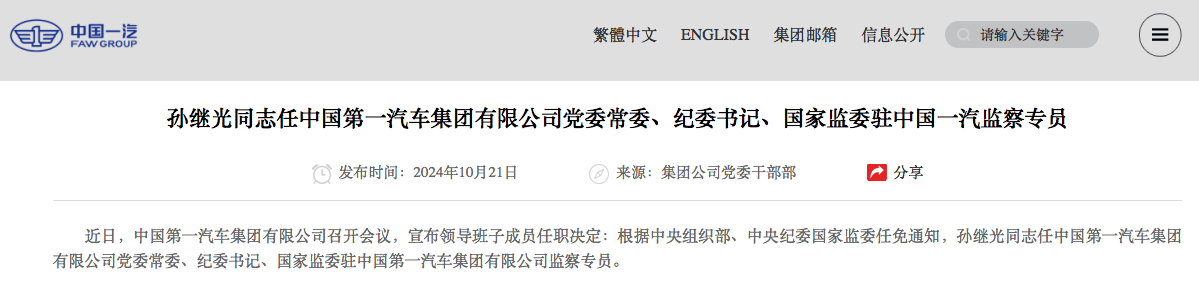 10月21日晚间,中国一汽官方宣布,中国第一汽车集团有限公司(下称“一汽集团”)召开会议,宣布领导班子成员任职决定:根据中央组织部、中央纪委国家监委任免通知,孙继光同志任中国第一汽车集团有限公司党委常委、纪委书记、国家监委驻中国第一汽车集团有限公司监察专员。孙继光加入一汽集团后,一汽集团领导成员由邱现东、刘亦功、王国强、孙继光、方世力、梁贵友、吴碧磊、陈彬,共8名成员组成,其中邱现东为董事长,刘亦...