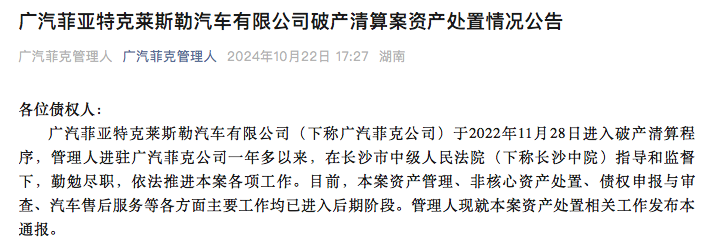 10月22日,广汽菲克管理人在其微信公众号发布广汽菲亚特克莱斯勒汽车有限公司(下称“广汽菲克”)破产清算案资产处置情况公告。公告显示,广汽菲克管理人于2024年10月22日进行第四次挂网拍卖,本次起拍价按上一次流拍价的90%即约11.03亿元,保证金1亿元,公示期15日,自2024年11月6日10时开拍至2024年11月7日10时止。本次为第四次挂网拍卖,在此之前,广汽菲克长沙工厂及附属的建筑物、...