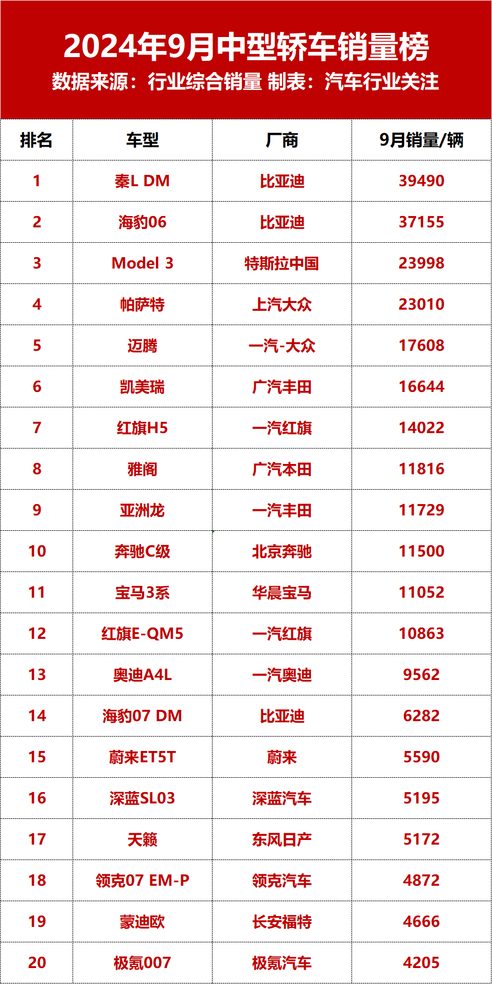 9月中型车销量榜来了!从《汽车行业关注》统计的9月中型轿车销量top20榜单来看,9月共有2款车型销量超3万辆,分别为秦LDM、海豹06;2款车型销量超2万辆,分别为Model3、帕萨特;此外,包括迈腾、凯美瑞、红旗H5、雅阁、亚洲龙、奔驰C级、宝马3系、红旗E-QM5共计8款车型销量超万辆。具体来看,9月中型轿车冠军和亚军依然被比亚迪承包,秦LDM、海豹06销量分别为39490辆和37155辆,...