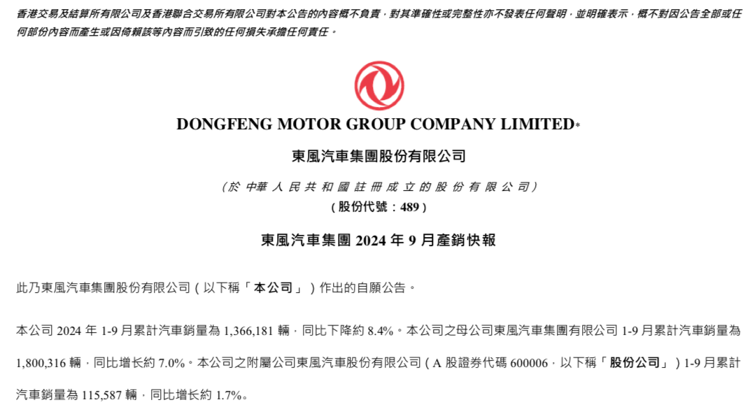 10月10日,东风汽车集团股份有限公司(下称“东风集团”)发布今年9月和前9月销量数据。数据显示,9月东风集团销量为16.80万辆,同比下滑16.4%;1-9月东风集团销量为136.62万辆,同比下滑8.4%。值得一提的是,在此之前,东风集团销量已连续五年销量下滑,据统计,2018年至2023年,东风集团销量分别为305.22万辆、293.20万辆、286.83万辆、277.51万辆、246.45...