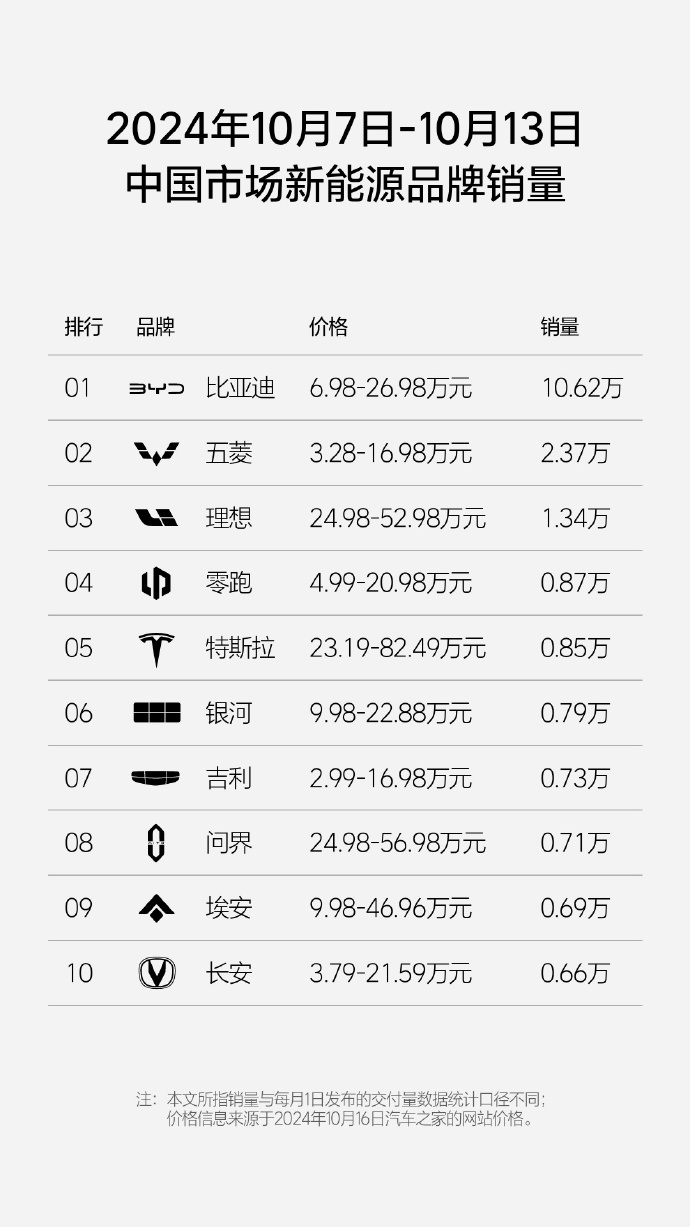 10月16日,理想汽车发布2024年第41周(10月7日至10月13日)销量榜单。先来看看中国新能源汽车品牌销量榜单,第41周共有3家车企销量超万辆,其中,比亚迪以10.62万辆蝉联榜首,五菱和理想汽车紧跟其后,周销量分别为2.37万辆和1.34万辆;零跑汽车和特斯拉销量分别为0.87万辆和0.85万辆。此外,其他品牌销量均低于8000辆,其中,银河汽车、吉利汽车、问界、埃安、长安汽车周销量分别为...