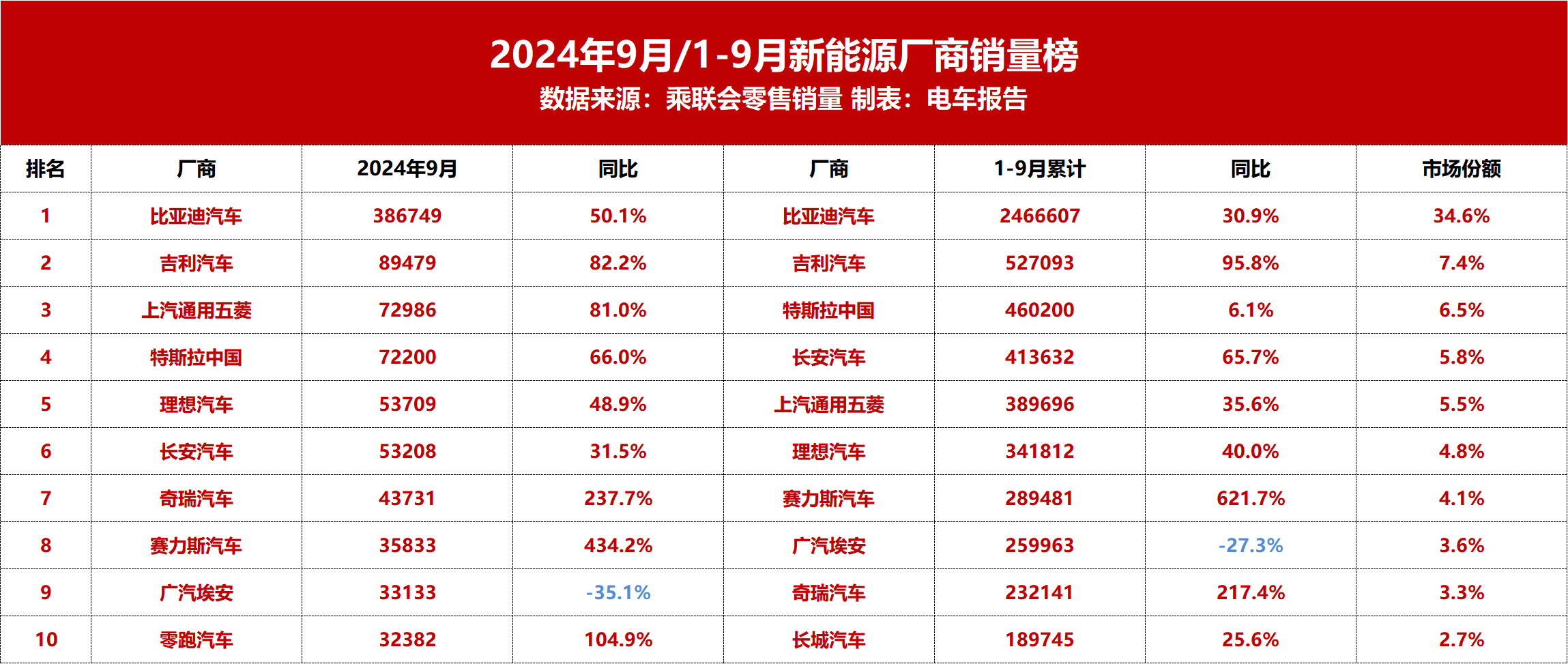 10月12日,乘联会发布最新月度市场报告。数据显示,2024年9月国内乘用车市场零售销量为210.9万辆,同比增长4.5%,环比增长10.6%。其中,常规燃油车零售销量为99万辆,同比下滑22%,环比增长12%;而新能源乘用车零售销量为112.3万辆,同比增长50.9%,环比增长9.6%。9月新能源车国内零售渗透率为53.3%,为年内连续三个月突破50%。从厂商零售销量排名来看,9月零售销量排名前...