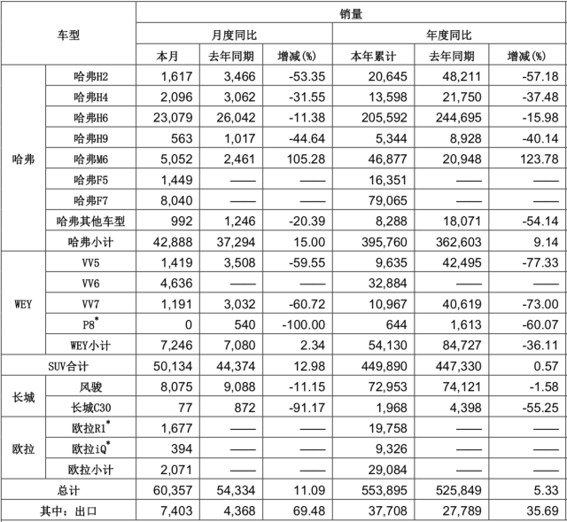 汽车行业关注(autochat.com.cn)08月09日报道——长城汽车发布2019年7月产销数据,从数据显示,今年7月,长城汽车共销售新车60357辆,同比增长11.09%,今年1-7月,长城汽车累计销量达553895辆,较去年同期上涨5.33%。此外,长城汽车的全球化战略下,今年7月,长城汽车共出口新车7403辆,同比劲增69.48%;1-7月,长城汽车累计出口新车达37708辆,同比增长35.69%。长城汽车旗下拥有多项品牌,哈佛、WEY、欧拉和长城皮卡分别销售42888辆、7246辆、2071辆及8075辆,哈佛品牌也是贡献最大的。哈弗创下了连续9年蝉联中国SUV销量榜首的记录, 7月销量达42888辆,同比上涨15%;1-7月,累计销量达395760辆,同比增长9.14%。虽说在车市淡季中,长城汽车依然能保持增长实属不易。不过值得注意的是,相比去年同期,长城7月销量增长主要得益于哈弗F5、哈弗F7、VV6、欧拉几款新车型贡献销量,哈弗H6、VV5、VV7等车型相比去年同期都有大幅下降。2019年年初,长城汽车公布去年的净利润同比增长6.97%,达到了53.95亿元。同时,把2019年全年的销量目标乐观的定在了120万台。长城汽车连年销量破百万,而且还定下了一个更大的目标,但其实长城汽车自2017年以来,平均单车利润一直呈下降趋势。今年上半年平均单车利润达到了0.32万元,还不及2018年的50%。7月中旬,长城汽车公布了上半年的销售成绩,车卖的多了但净利润在下降。上半年总共销售了49.53万台,同比增长4.7%;但净利润同比下降58%,下降达到15.7亿元。一增一减,增的是销量、减的是净利润。长城汽车在公告中表示,业绩预减的主要原因是提高产品优惠额度让利消费者,并继续加大品牌推广力度及研发投入,致使归属于上市公司股东的净利润同比下降。基于此,长城汽车又将2019年度销量目标由此前的120万辆调整为107万辆。上半年的49.35万辆销量,占了最新年度目标107万辆的46%,市场下滑,长城汽车却逆势增长,涨幅达到4.7%,虽然涨幅跑赢了市场大盘,数据看上去也很华丽,但下半年若继续以价换市,提高市场占有率,长城汽车则要接受数十亿的亏损。在整体车市调整时期,长城汽车将年销量目标提到一个新高度,不平稳度过还寻求更高的目标,是好事但也要分时机。而今年前7个月长城汽车的销量已经完成年度目标的将近52%,接下来的5个月长城汽车依然面临较大的销量压力。 欢迎订阅微信公众号《汽车行业关注》,第一时间汽车行业内幕消息,一起说说汽车圈子那些事。欢迎爆料!微信号autoWechat