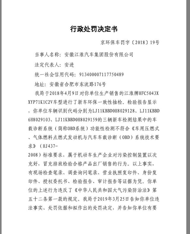 汽车行业关注(autochat.com.cn)07月05日报道——安徽江淮汽车集团股份有限公司因排放造假,收到北京市生态环境局的行政处罚决定书,被罚1.7亿元。江淮汽车已确认此事。 从处罚书中了解,北京市生态环境局于2018年4月9日对江淮汽车生产销售的江淮牌HFC5043XXYP71K1C2V车型进行了新车环保一致性抽检。检验报告显示,江淮汽车识别代码分别为LJ11KBBD0H8029128、LJ11KBBD6H8029103、LJ11KBBD0H8029159的三辆新车检测结果中的车载诊断系统(简称OBD系统)功能性检测不符合《车用压燃式、气体燃料点燃式发动机与汽车车载诊断(OBD)系统技术要求》(HJ4372008)标准要求,属于机动车生产企业对污染控制装置以次充好,冒充排放检验合格产品出厂销售的行为。此前,针对涉嫌排放造假,江淮汽车5月10日发布澄清公告,涉事京五排放载货汽车在北京市场销售了700余台。江淮汽车在公告中表示,北京市生态环境局曾于去年4月对公司新车环保一致性进行抽查,同年7月发现,公司三辆京五状态载货汽车产品疑似存在问题。北京市生态环境局在5月5日发布公告,江淮汽车涉嫌对机动车污染控制装置以次充好,冒充排放检验合格产品出厂销售,将对该行为进行重大处罚,拟对案件举行听证。于江淮汽车提出听证延期申请,最终该案件的听证延期到5月16日举行。江淮还称,公司正联合相关发动机供应商进行深入的技术研究,分析可能产生问题的原因,同时也在积极配合北京市生态环境局做好听证环节的相关准备工作。鉴于听证会尚未召回,因此对公司的影响尚不确定。但经复核得到的检验报告显示,有三辆新车检测结果中的车载诊断系统功能性检测不符合标准要求,属机动车生产企业对污染控制装置以次充好,冒充排放检验合格产品出厂销售的行为。北京市生态环境局认为江淮汽车陈述申辩意见不影响对违法事实的认定,免于处罚的意见不予采纳。因此,北京市生态环境局决定,责令江淮汽车针对污染控制装置以次充好,冒充排放检验合格产品出厂销售的违法行为停产整治,没收这一违法所得,并处货值金额二倍罚款,共计1.7亿元。业绩报告显示,江淮汽车2018年营业收入达501.61亿元,同比增长1.95%;但归属于上市公司股东的净利润为亏损7.86亿元,同比下降282%。 欢迎订阅微信公众号《汽车行业关注》,第一时间汽车行业内幕消息,一起说说汽车圈子那些事。欢迎爆料!微信号autoWechat