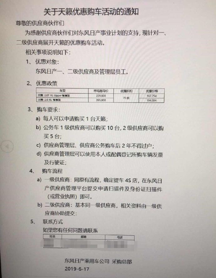 汽车行业关注(autochat.com.cn)06月21日报道——国内汽车销量持续下滑,低迷环境下碰上国五国六排放标准的切换,导致各品牌厂家大量国五库存车积压。众多车企为了在7月之前清理库存车,宁愿亏本也要想办法让经销商出售库存车,从而采取大幅降价措施,也有不少车企用打着内部员工购车优惠的口号,让员工及供应商帮助消化库存。最近就有媒体爆出天籁优惠购车活动的通知。该通知内容就是内部员工可优惠购车,每人只可申购一台车,优惠折扣为7.3折。分别是售价22.98万元的2.0T UPPER智享版和售价26.58万元的2.0T 智尊版。其次,两者都可以打73折,算下来裸车的价格分别为16.78万元和19.4万元,非常划算。而此次优惠活动的车型两款都是天籁。但通过了解,这两款天籁都是国六车型,并且还是一款刚上市不久的车型。迎来全新换代的天籁,新车一改往日圆润中庸的造型,变得棱角分明,非常犀利。不仅如此,发动机也换上了日产最新的2.0T涡轮增压发动机,这台发动机相比其他的2.0T最大的技术亮点就是可以改变气缸压缩比,让车辆能在澎湃动力和舒适节油两者之间随意切换。不过目前2019款的日产天籁没有优惠活动的情况下,起步价格要20多万元,有很多网友看到这一个价格,都纷纷的表示,实在是有些贵了。 对飚丰田凯美瑞和本田雅阁,自换代以来天籁销量成绩不算突出,2019年前四个月累计售出新车2.32万台,平均月销6千台左右,整体只能说中规中距,和对手的轻松月销万台相比还是要差不少的。以往日产都是通过优惠促销的营销方式,一直都拥有着不错的业绩。或许新车刚上不久,也没有过多的优惠,并且面临国内汽车行业的销量下滑,日产想通过一些方式来提升下业绩。欢迎订阅微信公众号《汽车行业关注》,第一时间汽车行业内幕消息,一起说说汽车圈子那些事。欢迎爆料!微信号autoWechat