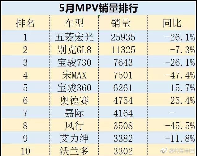 汽车行业关注(autochat.com.cn)06月14日报道——据乘联会最新发布的销量数据显示,5月份MPV市场累计销量10.8万辆,同比下降22.9%,环比增长6.5%;1-5月累计销量58.0万辆,同比下降21.4%。 继轿车与SUV下滑以后, MPV市场同样在下滑,并不比轿车、SUV少,同样销量下滑严重。MPV市场5月大多数车型仍以下跌为主,整体排名变化较大。 五菱宏光5月共销售25935辆,同比下滑26.1%,再次卫冕MPV市场销量冠军。虽然是销冠,但是下滑26.1%是不争的事实,寒冬下的五菱宏光依然无法改变下滑的命运。 别克GL8 5月同比下滑7.3%,而在4月份的别克GL8仅售出8580台,下滑幅度高达37%,同比上月销量增长不少,但仍以11325辆的成绩排在第二。宝骏730借极具性价的定价,重回高点,以7643辆的成绩超越比亚迪宋 MAX进入前三。自主品牌中,比亚迪宋MAX,一款备受好评的MPV车型,如今的销量依然在下滑,而且趋势越来越大,5月共计销售7501辆,同比下滑47.4%,排在MPV销量榜的第四名。宝骏360销量为6267辆,同比上涨15.7%,涨幅仅次于奥德赛,排在第五名。5月吉利嘉际销量有所攀升,销量为4164辆,排在MPV销量榜的第七名。一经上市就好评不断,得益于吉利的品牌口碑,所以嘉际的销量增长并不意外。风行5月共销售3508辆,排名第八。合资品牌MPV中,奥德赛凭借着4754辆的销售数据,同比上涨25.4%,涨幅在前十五名的车型中最大,占据了第六的位置。沃兰多表现突出,5月共计销售3302辆,进入前十。这款车并不像MPV,反而像一台运动气息十足的SUV车。欢迎订阅微信公众号《汽车行业关注》,第一时间汽车行业内幕消息,一起说说汽车圈子那些事。欢迎爆料!微信号autoWechat