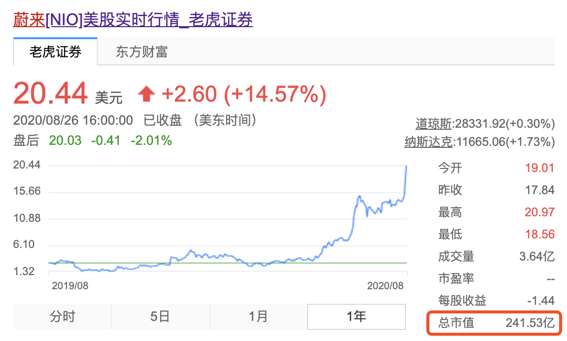 汽车行业关注(autochat.com.cn)08月27日报道——自进入2020年,蔚来汽车在销量和业绩实现提升的环境下,股价不断实现攀升。至昨日美股最新收盘价再度上涨19.17%至20.44元,市值达242亿美元,再创下最新历史新高。相信看到蔚来汽车这样飞涨的股价已有不少网友安耐不住,纷纷表示“如何购买美股”或是“早知当初选择买入部分蔚来的股票”。毕竟较蔚来汽车今年年内股价低点2.11美元/股,...