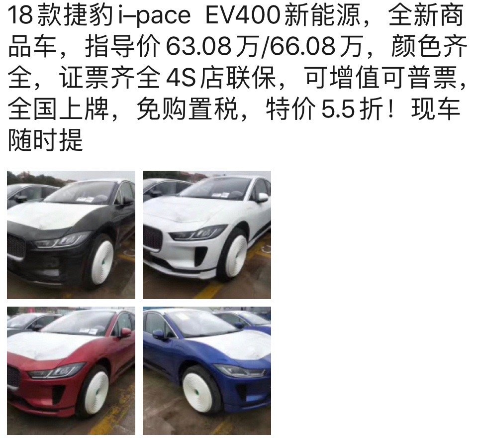 汽车行业关注(autochat.com.cn)03月05日报道——对于捷豹品牌相信大家都非常熟悉,一个源自英国的豪华品牌,却凭借“七折虎、八折豹”在豪华市场负有盛名,用着较高的终端优惠价格吸引着部分青睐者。近日,又有网友发现捷豹旗下一款车型竟出现五折的抛售情况。根据一张朋友圈的截图显示,捷豹旗下一款指导价为63.08万/66.08万元的18款新能源I-PACEEV400的全新车,打出了5.5折的特...