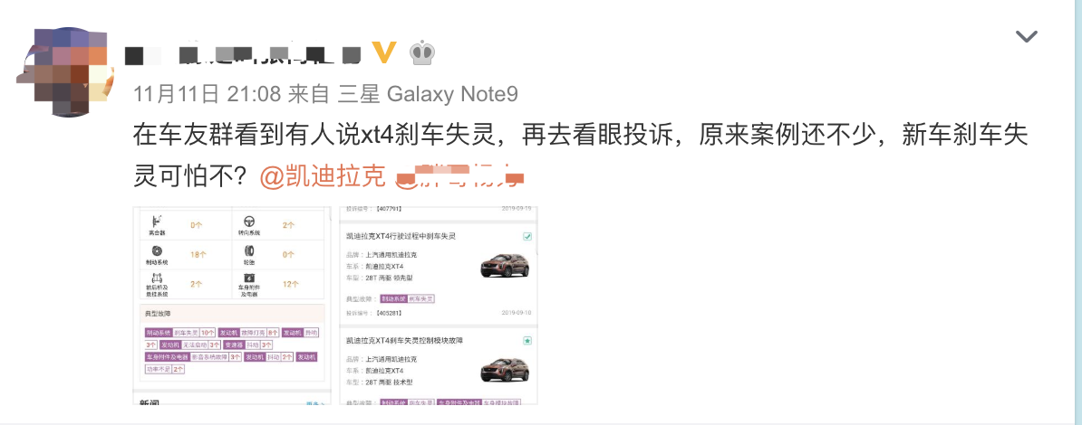 汽车行业关注(autochat.com.cn)11月12日报道——刹车安全对于车辆来说是一个最近本的要求,因为这问题将可能威胁到人身安全,轻者车辆受损,重者可能造成车毁人亡,并诛连他人。近日,有网友爆料,自己有一辆凯迪拉克XT4,但通过了解发现该车辆有多起关于刹车失灵的投诉,对此感到有些后怕。从网友提供的图片中可以看到是关于某汽车投诉品台的车型故障投诉统计,其中刹车失灵的问题就有10个。 ...
