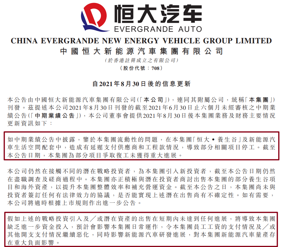 9月24日,恒大汽车发布公告称,鉴于集团流动性的问题,在集团恒大养生谷及新能源汽车生活空间配套中,造成有延迟支付供应商和工程款情况,导致部分相关项目停工。截至公告,集团为部分项目争取复工未获得重大进展。另外,恒大汽车还表示,公司仍然在接触不同的潜在战略投资者,为集团引入新投资者,截至公告,仍然在尽职调查及磋商过程中。集团尚未与投资者签订任何有法律效力的协议,是否能实现上述潜在出售尚有不确定性。如有...